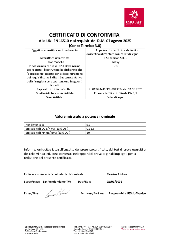Dieses Produkt entspricht der Klasse 5 Sterne gemäß den Emissions- und Leistungsanforderungen des Dekrets vom 7. November 2017, Nr. 186 (Italien).